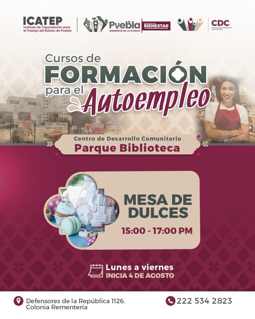 Puebla, Pue.- Como parte del compromiso del presidente municipal Pepe Chedraui de poner orden en la ciudad y generar oportunidades para el desarrollo económico, el Gobierno de la Ciudad invita a la ciudadanía a inscribirse en los cursos gratuitos de capacitación para el autoempleo que se realizarán en distintos Centros de Desarrollo Comunitario (CDC) y el Parque Biblioteca, en coordinación con el Instituto de Capacitación para el Trabajo del Estado de Puebla (ICATEP).