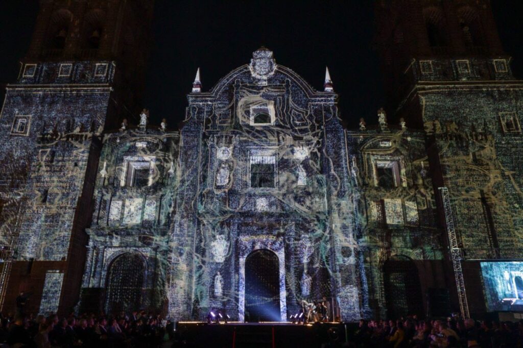 El segundo acto se llevó a cabo a las 20:00 horas en el Atrio de la Catedral de Puebla, donde se presentó el montaje principal ante las personas previamente registradas. Para garantizar la accesibilidad, se instalaron pantallas de alta definición alrededor del Zócalo, permitiendo que miles de asistentes vivieran la experiencia en tiempo real desde distintos puntos del Centro Histórico.