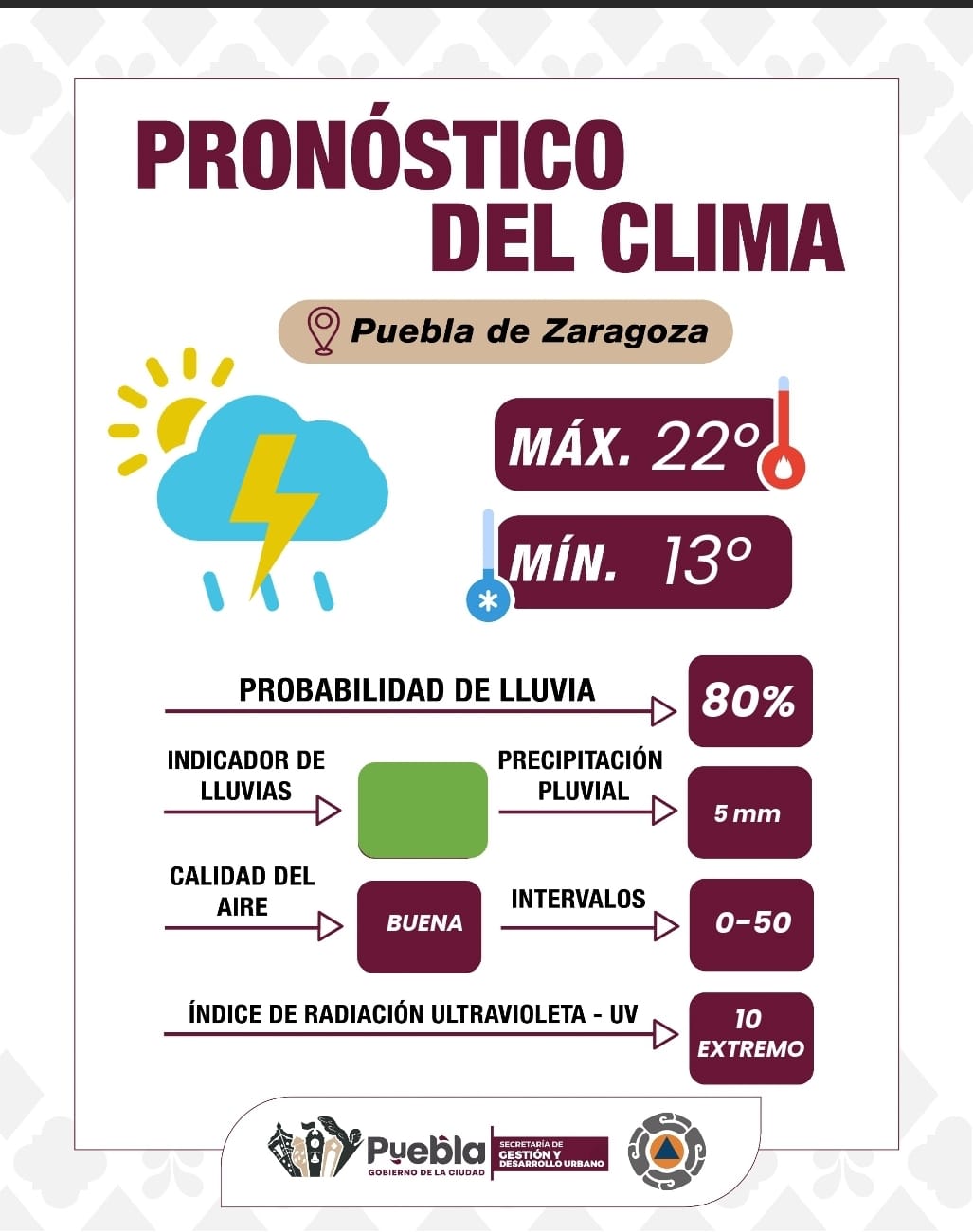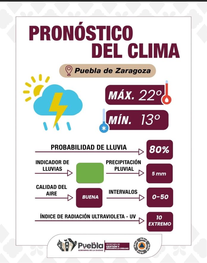 Puebla, Pue.- El Gobierno de la Ciudad informa que para este día se espera un día parcialmente nublado con alta probabilidad de lluvias a partir de las 14:00 y hasta las 19:00 horas. Se estima una acumulación de 5 mm de precipitación, con temperaturas que oscilarán entre una mínima de 13°C y una máxima de 22°C. Asimismo, se prevé un índice UV en niveles extremos, por lo que se exhorta a protegerse adecuadamente del sol. Durante el periodo de lluvia, se pronostican vientos de hasta 23 km/h entre las 15:00 y 17:00 horas. La calidad del aire se mantiene en niveles óptimos.