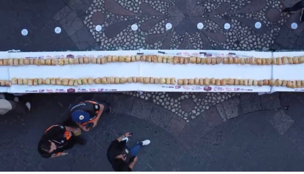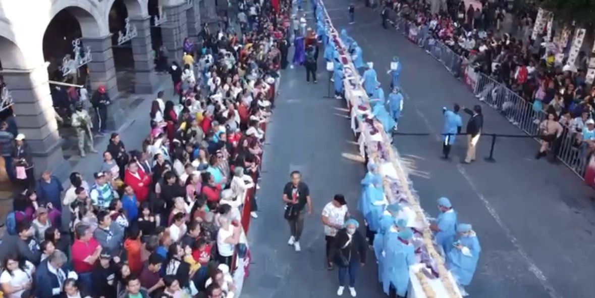 Puebla, Pue.– La meta se cumplió. Puebla capital logró escribir su nombre en el Guinness World Records con el título de la “línea de panes más larga del mundo”, con 19 mil 010 piezas que juntas formaron la rosca de Reyes de alrededor de 6 kilómetros.