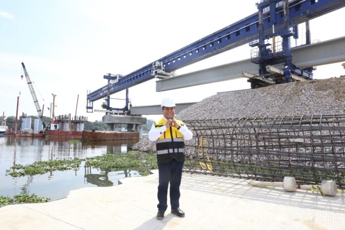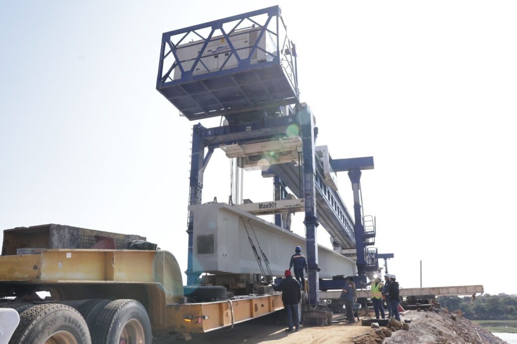 Puebla, Pue. – Con personal y maquinaria especializada, avanza en la colocación de trabes que conformarán la estructura del puente vehicular que sustituirá a La Panga y que conectará a siete municipios de la región de Valsequillo.