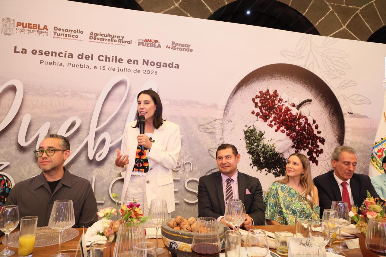Puebla, Pue.- Al dar inicio formal a la Temporada de Chiles en Nogada 2025, uno de los platillos más emblemáticos de la gastronomía poblana, la secretaria de Turismo del Gobierno de México, Josefina Rodríguez Zamora, invito a todas y todos a que visiten Puebla, ya que dicho platillo es identidad culinaria que refleja la independencia de un país y la creatividad de las cocineras.