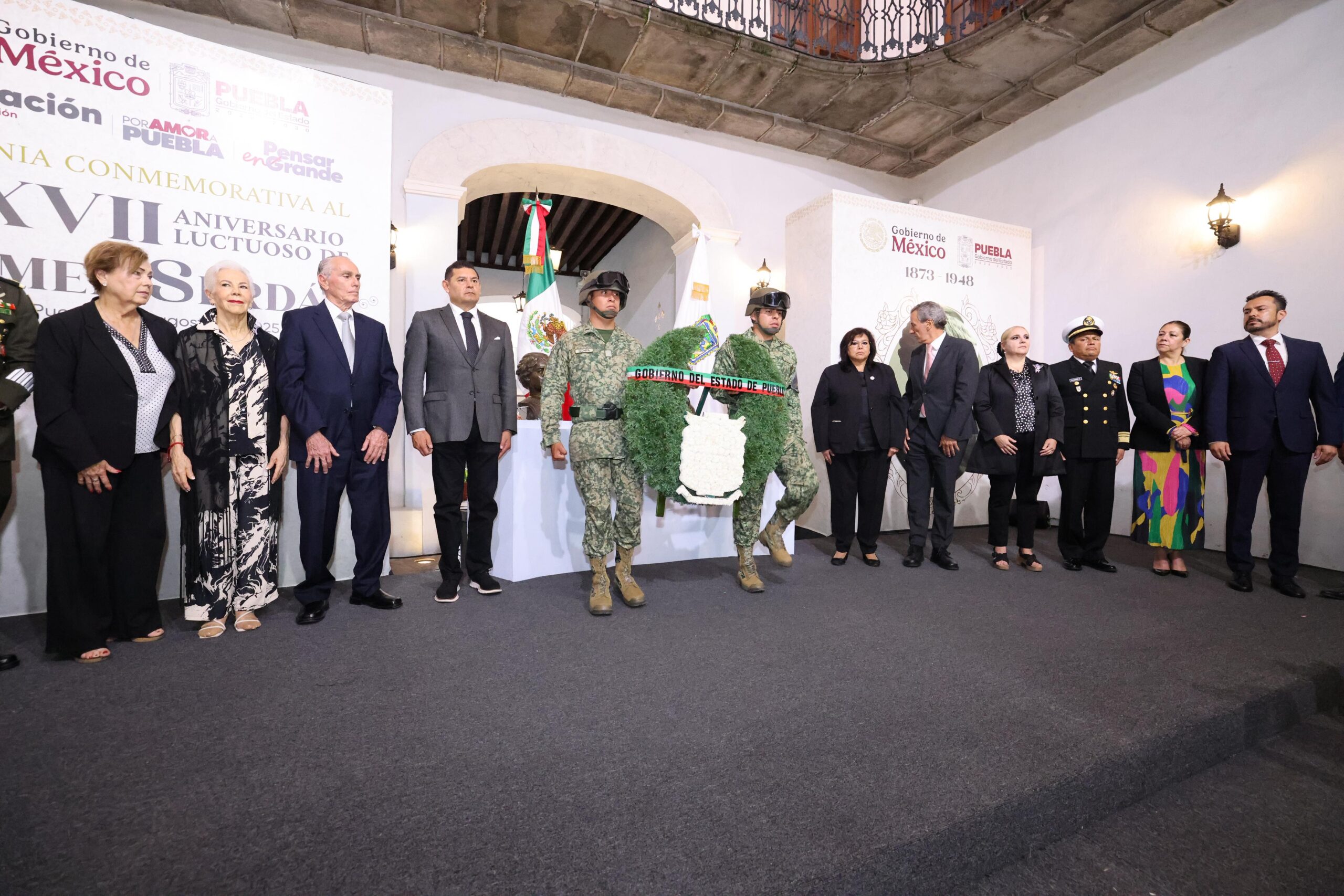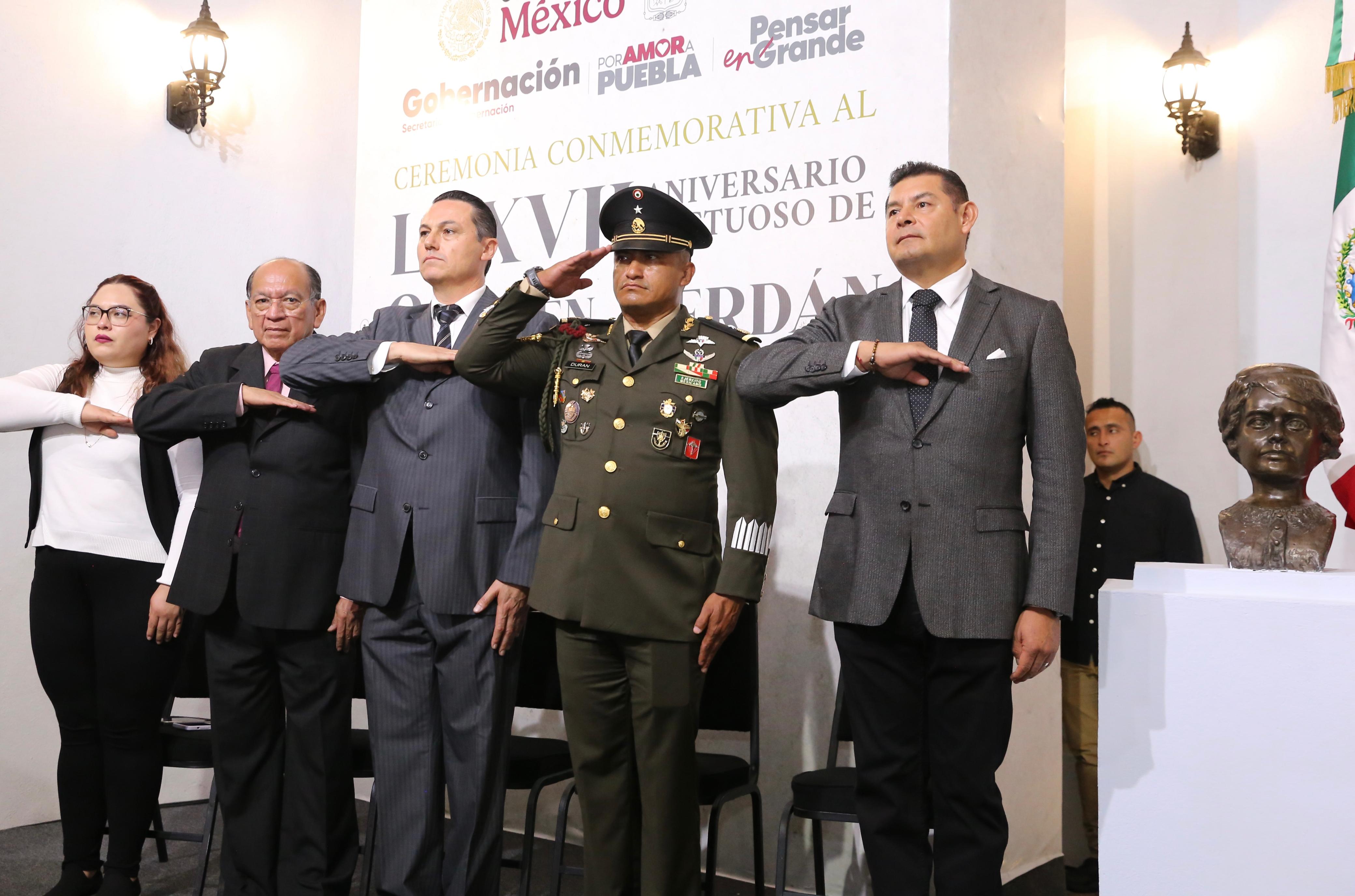 Encabezado por el gobernador Alejandro Armenta, en la ceremonia estuvieron presentes, la presidenta del Tribunal Superior de Justicia del Estado, Magistrada María Belinda Aguilar Díaz; en representación de la 25 Zona Militar, el general de Brigada de Estado Mayor, Julio Cesar Durán Simón; así como el secretario de Gobernación, Samuel Aguilar Parra, el secretario de Seguridad Pública, vicealmirante Francisco Sánchez y la titular de Arte y Cultura, Alejandra Pacheco. Además de la presidenta del Congreso del Estado, Laura Artemisa García Chávez y el representante de la Casa de los Hermanos Serdán, Máximo Serdán Álvarez.
