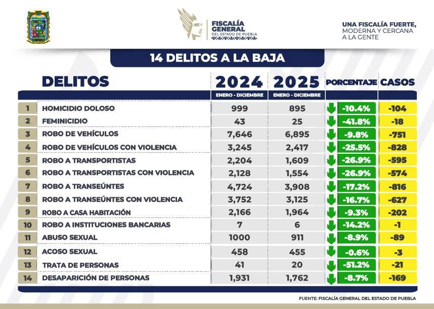 Puebla, Pue.- Durante el primer bimestre de 2026, la incidencia delictiva registró una disminución del siete por ciento en comparación con el mismo periodo de 2025, lo que se traduce en 21 delitos a la baja. “Tenemos la convicción plena, que nuestra responsabilidad coadyuvará con la seguridad, procurar la justicia y contribuir al desarrollo de la riqueza comunitaria», afirmó el gobernador de Puebla Alejandro Armenta Mier.