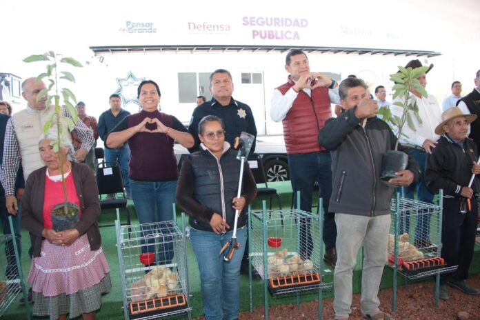 Entregó un paquete de diez pollitas de postura, acompañado de insumos y equipo para la instalación de jaulas metálicas. Asimismo, se distribuyeron árboles frutales de limón, higo, ciruela y nogal, además de insumos y herramientas para la instalación del huerto móvil.