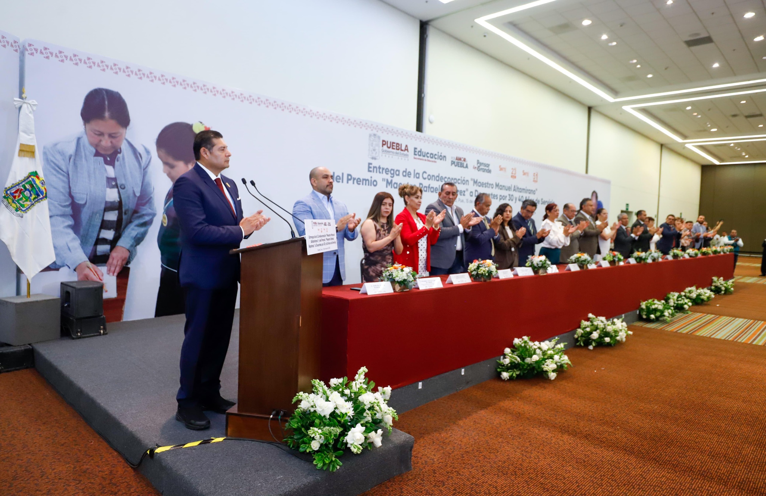 Puebla, Pue.- Con la reconstrucción del CAPCEE se apoyará más a las escuelas, con la auditoría del ISSSTEP se atenderá con dignidad a los maestros y con el Programa de Obra Comunitaria se apoyará con paneles solares a las instituciones educativas, afirmó el gobernador Alejandro Armenta, al entregar la Condecoración “Maestro Manuel Altamirano” por 30 años de servicio y el premio «Maestro Rafael Ramírez», por 40 años de trabajo a profesores del estado.