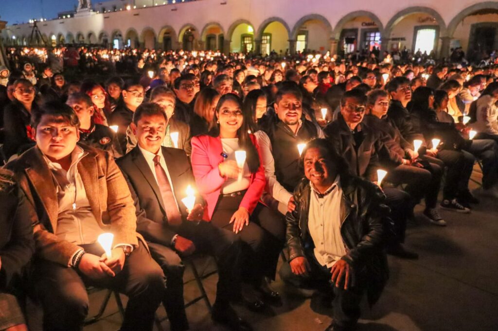 En punto de las 20:00 horas, el primer cuadro de la ciudad quedó a oscuras, dando paso a velas y antorchas que envolvieron de misticismo la Plaza de la Concordia y marcaron el inicio del Concierto de Campanas, apreciado en silencio por cientos de asistentes.