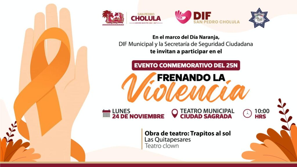 San Pedro Cholula, Pue. – Con motivo del Día Internacional para la Eliminación de la Violencia contra las Mujeres y las Niñas, el Gobierno de San Pedro Cholula, a través del DIF Municipal, Casa Carmen Serdán y la Secretaría de Seguridad Ciudadana, llevará a cabo tres actividades conmemorativas bajo el nombre “Frenando la violencia”, con el propósito de fomentar la reflexión, la participación y la igualdad.