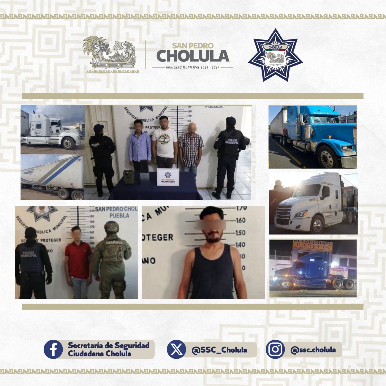 En lo que va del año, se han recuperado cinco unidades tipo tractocamión en distintos puntos del municipio, resultado de operativos estratégicos y la atención inmediata a reportes ciudadanos. Además, ocho personas han sido detenidas por su probable participación en delitos como robo a transportistas, robo con violencia de mercancía y ataques a las vías de comunicación. Todas fueron puestas a disposición de la autoridad competente para continuar con las diligencias correspondientes.
