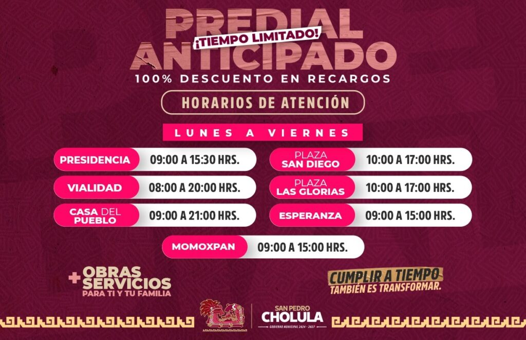 Así como en Plaza Las Glorias: lunes a viernes de 10:00 a 17:00 y sábado de 10:00 a 14:00 horas; Plaza San Diego: lunes a viernes de 10:00 a 17:00 y sábado de 10:00 a 14:00 horas; Plaza Esperanza: lunes a viernes de 10:00 a 15:00 horas y Presidencia Auxiliar de Santiago Momoxpan: lunes a viernes de 09:00 a 15:00 horas.