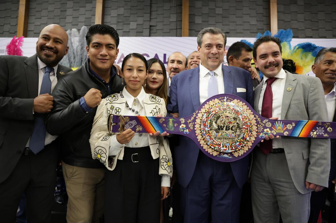 Ciudad de México.- El Consejo Mundial de Boxeo (WBC) presentó el cinturón conmemorativo “Nahui Huey Altepemeh”, pieza que será disputada el próximo 13 de septiembre en la pelea entre Saúl “Canelo” Álvarez y Terence Crawford, que refleja el talento de artesanos y artistas tlaxcaltecas y enaltece la identidad cultural del estado, al colocar a Tlaxcala en el escaparate internacional del boxeo, proyectando su arte y tradición a millones de espectadores en todo el mundo.