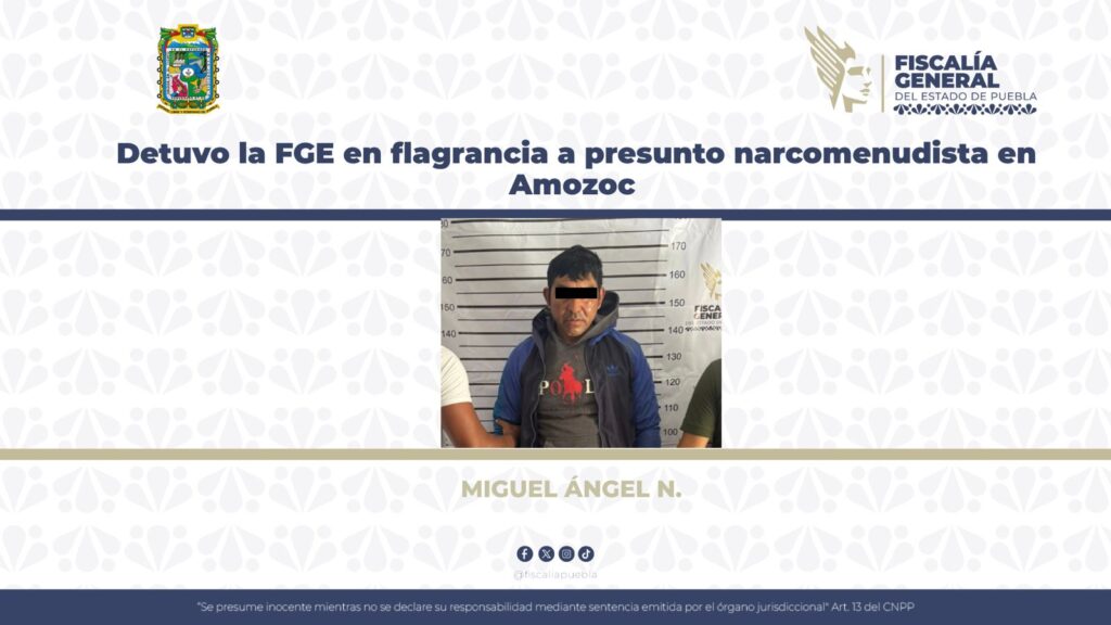 Puebla, Pue.- La Fiscalía General del Estado de Puebla informa que se logró la detención en flagrancia de Miguel Ángel N., de 49 años de edad, presuntamente dedicado a la venta de drogas en el municipio de Amozoc.