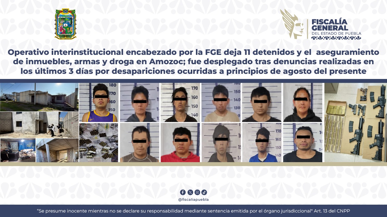Puebla, Pue.- Resultado de un operativo interinstitucional realizado por tierra y aire en el municipio de Amozoc, orientado a la localización de personas reportadas como desaparecidas, lograron la detención de 11 personas, el aseguramiento de inmuebles y diversos indicios relevantes, incluyendo armas de fuego, narcóticos y un vehículo. El dispositivo fue desplegado tras denuncias realizadas en los últimos tres días ante la FGE, correspondientes a desapariciones ocurridas a principios de agosto del presente.