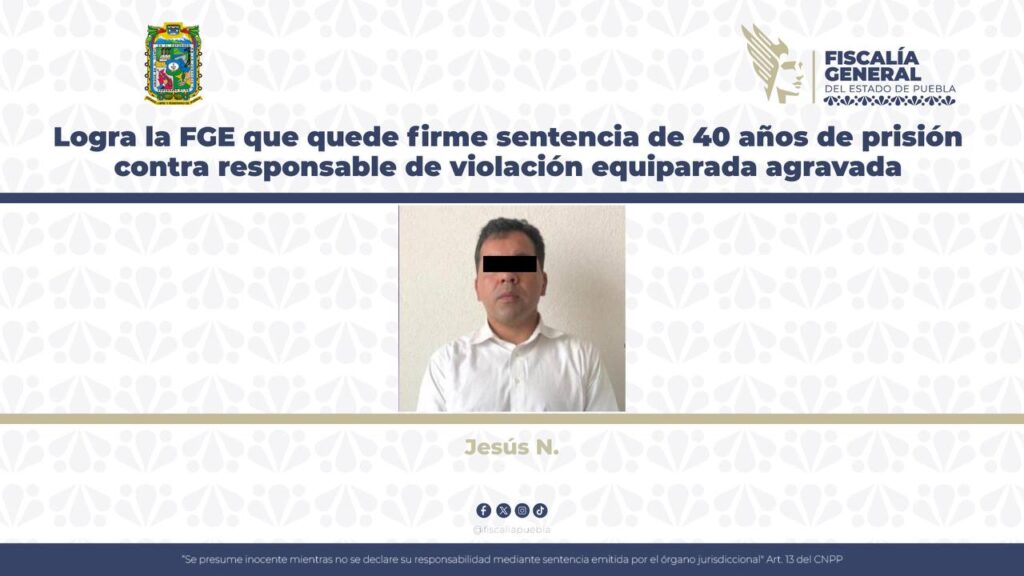 Puebla, Pue.- La Fiscalía General del Estado de Puebla informa que como resultado del trabajo jurídico sostenido por la Institución, quedó firme la sentencia de 40 años de prisión dictada contra Jesús N., por el delito de violación equiparada agravada.