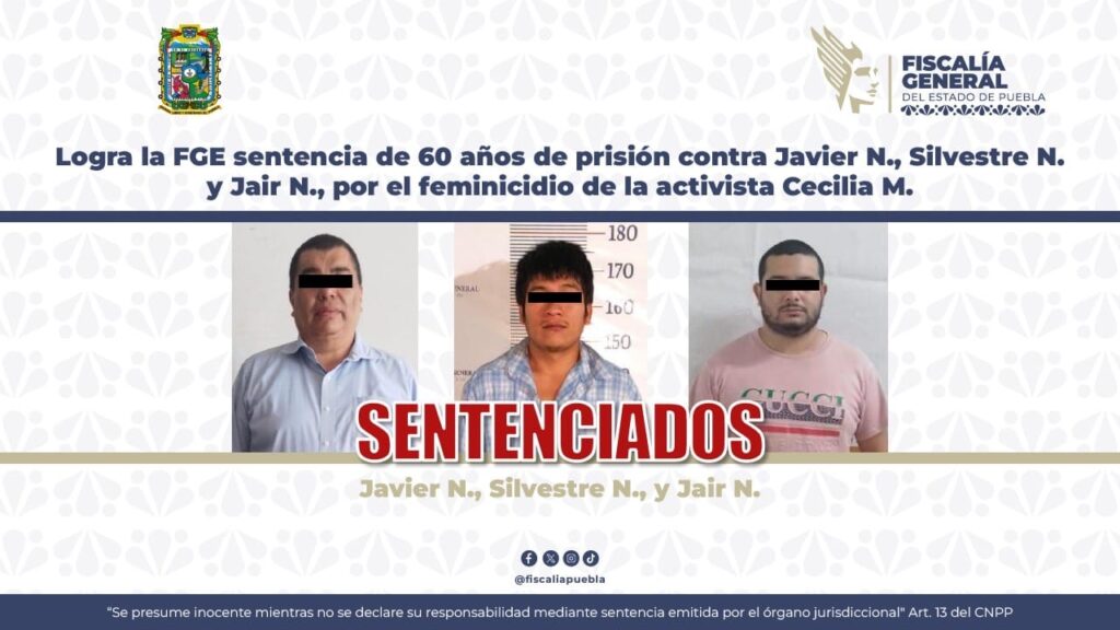 Puebla, Pue.- La Fiscalía General del Estado, logró en audiencia de Individualización de Sanciones, sentencia de 60 años de prisión contra Javier N., Silvestre N. y Jair N., como responsables del delito de feminicidio en agravio de Cecilia N., ocurrido en mayo de 2022.