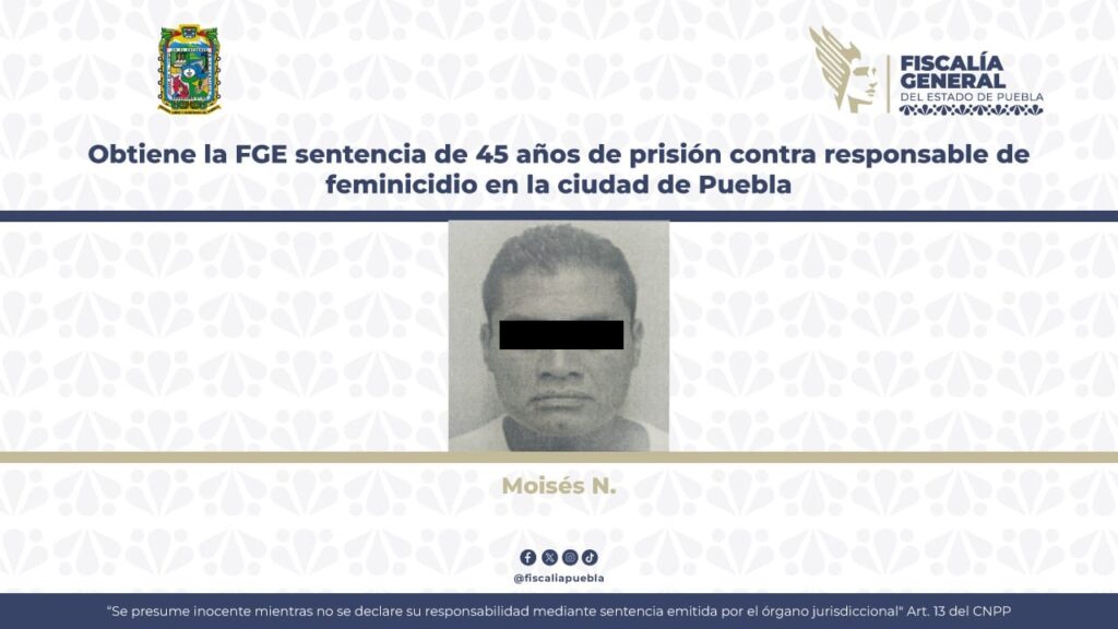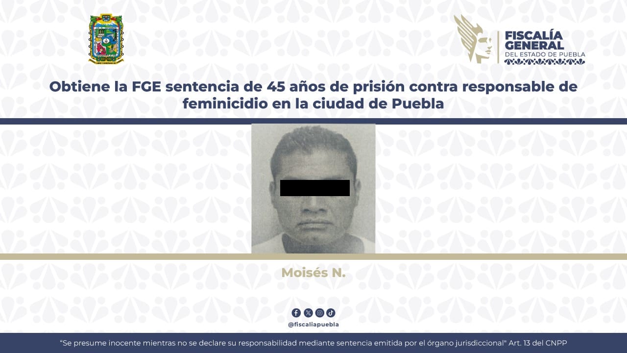 Puebla, Pue.- La Fiscalía General del Estado de Puebla acreditó la responsabilidad de Moisés N., en el delito de feminicidio cometido en agravio de su pareja sentimental, al interior de un domicilio ubicado en la colonia Santa Bárbara Sur, de la ciudad de Puebla.