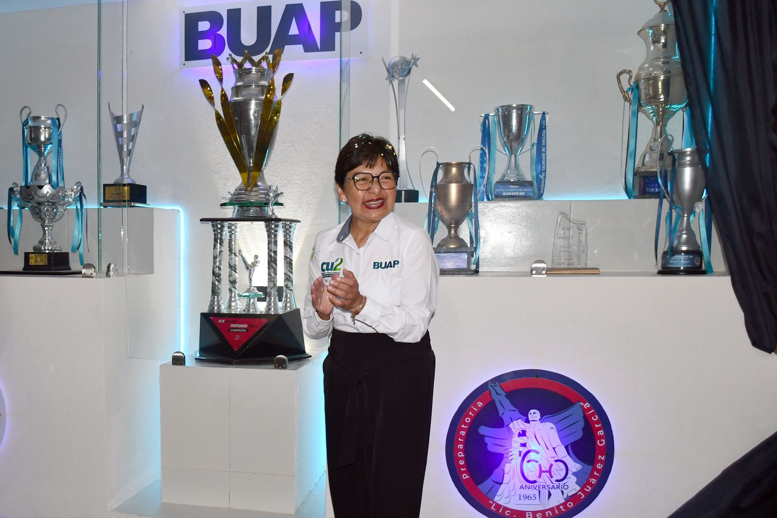 Como parte de los festejos, develó una vitrina de trofeos deportivos obtenidos por los alumnos. También inauguró el mural “Vamos juntos como manada”, de Cinthya Aguilar Muñoz, ganadora del primer concurso de mural titulado Los valores y trascendencia, en el que colaboraron estudiantes de la Facultad de Artes Plásticas y Audiovisuales. La autora comentó que en sus imágenes se muestra a una manada sólida, diversa y unida, donde se incluyen todas las voces para contar una historia de integridad.